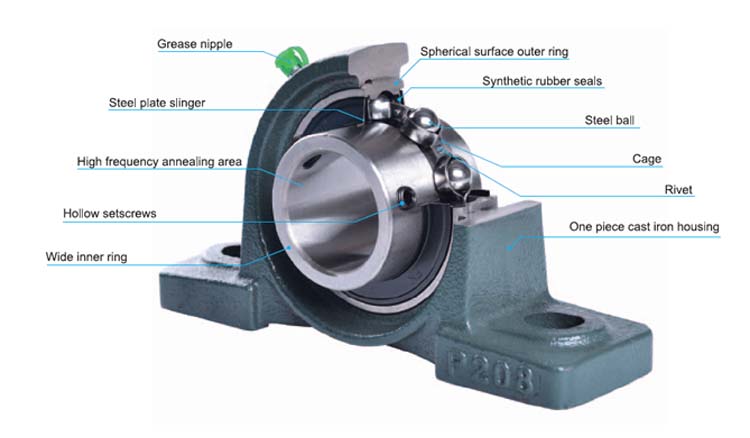 ఈ యూనిట్లు రేడియల్ బాల్ బేరింగ్స్, సీల్ మరియు హై గ్రేడ్ కాస్ట్ ఇనుము లేదా ప్రెస్డ్ స్టీల్ యొక్క గృహాల కలయిక, ఇవి వివిధ ఆకారాలలో వస్తాయి. మ్యాచింగ్ బేరింగ్ యొక్క బయటి ఉపరితలం మరియు హౌసింగ్ యొక్క అంతర్గత ఉపరితలం గోళాకారంగా ఉంటాయి, తద్వారా యూనిట్ స్వీయ సమలేఖనం అవుతుంది.